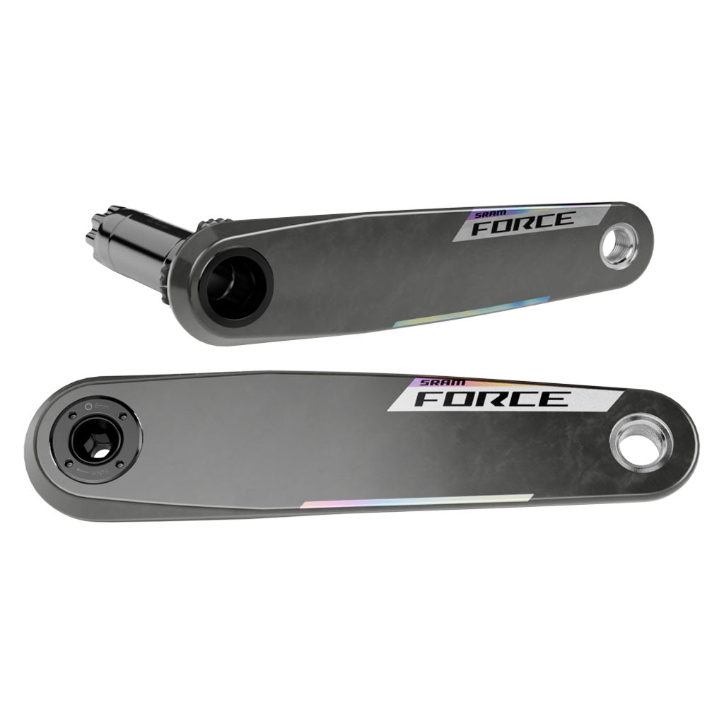 Form and function. The design of the Force crankarm is a wonder of carbon; light and stiff to effortlessly propel you forward. Available in lengths from 160 to 175 mm and in standard and Wide Q-factor so every rider can achieve their proper fit. The 8-bolt interface will fit any SRAM AXS spider or integrated chainring, with or without power. The light, stiff, and durable DUB spindle interface also fits nearly any frame.